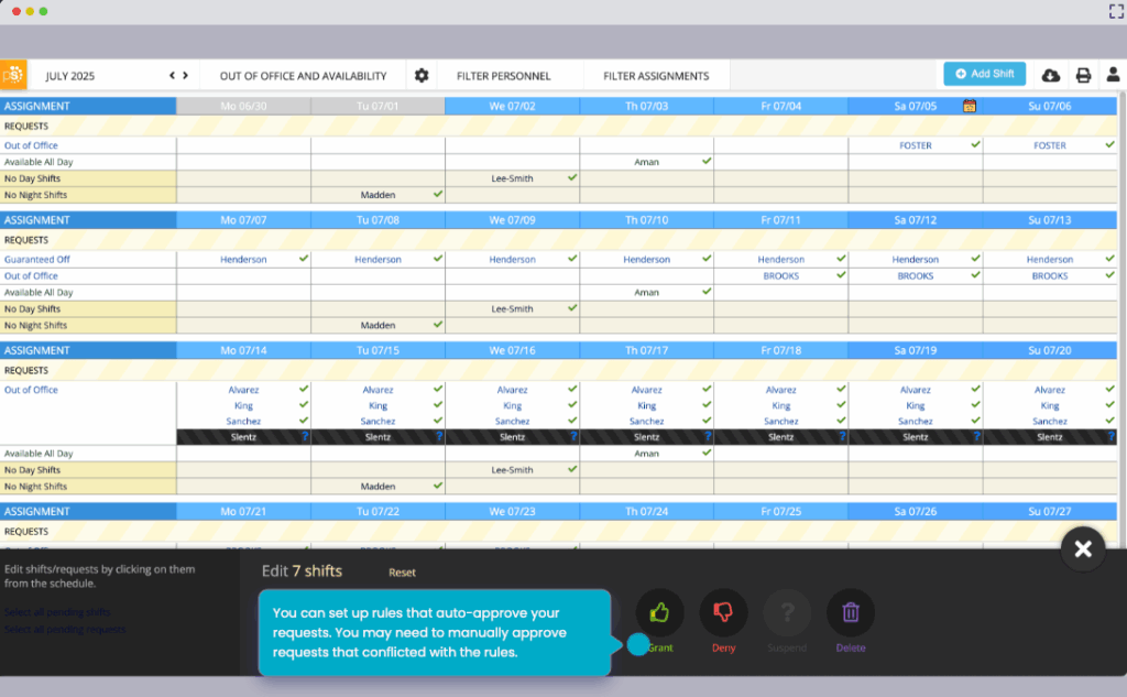 Lightning Bolt’s engine was built for complex rules. It searches the space of possibilities to produce the best schedule, not the first acceptable one, yielding fairer shift distribution, transparent time off, and fewer back-to-back grinds. Administrators set hard rules and soft preferences; the engine honors what matters most.