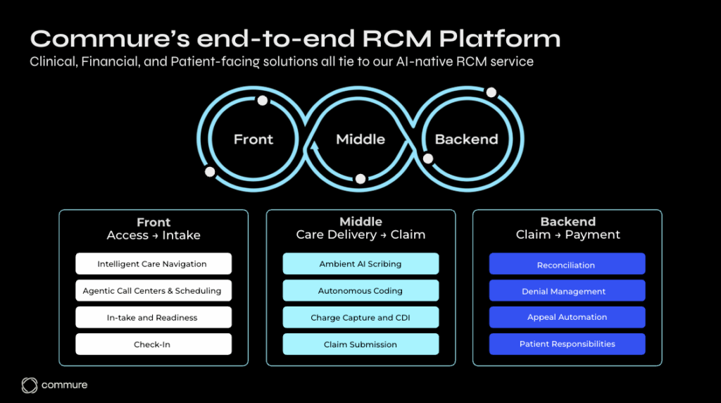 - Commure has built solutions that support end-to-end RCM. For example, its Ambient AI documentation solution creates specialty aware notes, and applies autonomous coding to aid in initial claim submission.