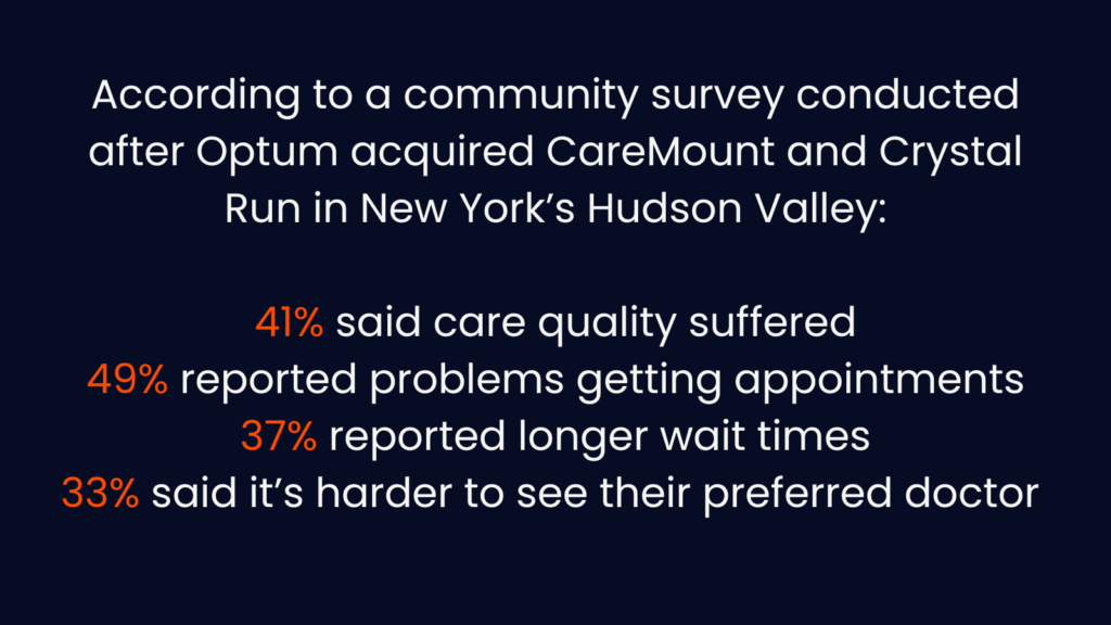 Patients felt the shift. In New York’s Hudson Valley, after Optum acquired CareMount and Crystal Run, Congressman Pat Ryan surveyed constituents and found: